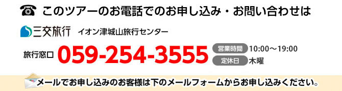 イオン城山(7:00)==== 三重会館(7:20)==== 津駅東口(7:30) ==== 名阪関ドライブイン(8:00~8:15)==== 嵐山[散策](10:00~)・・・嵐山駅 (11:00発)《嵐電:貸切》 四条大宮駅(11:30頃)==== 知恩院駐車場・・・京料亭『左阿彌』[昼食・舞踊](12:00~14:00)==== 京都御所[拝観](14:30~15:30) 井筒八ッ橋本舗[お買物](16:00~16:30)==== 関ドライブイン(17:40~17:55)==== 三重会館(18:05) ==== 津駅東口(18:25) ==== イオン城山(19:00)